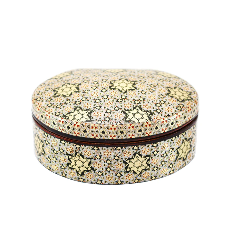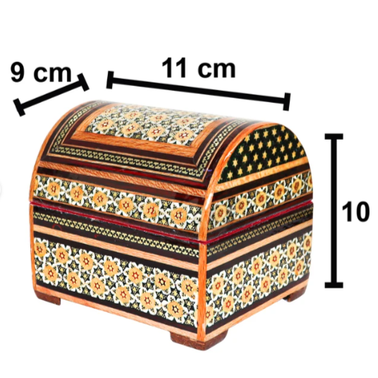Each box is meticulously decorated using the centuries-old Khatamkari technique: an intricate form of inlay marquetry made from fine slivers of brass, camel bone, walnut, pear wood, and ebony, arranged into mesmerizing geometric mosaics. The surface is polished with high-gloss polyester for durability and brilliance.