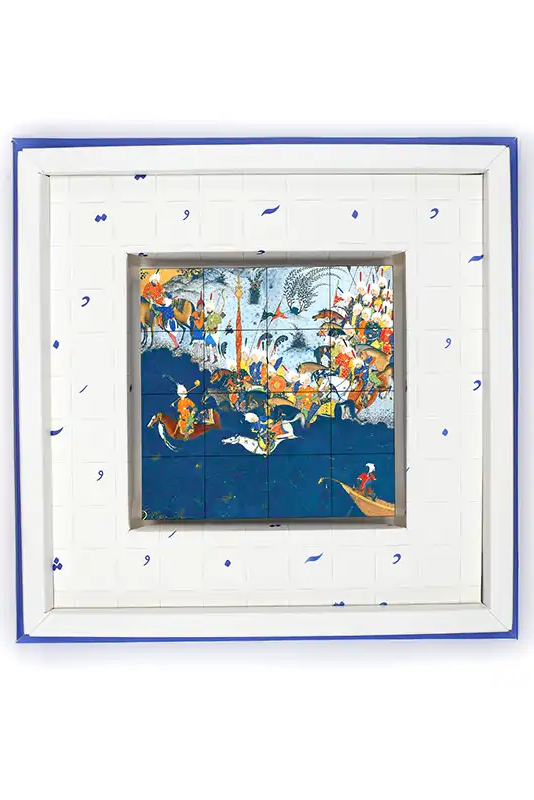 • Each piece reveals a scene reminiscent of royal banquets, mythical hunting fields, warrior legends, and turquoise tilework—echoing the elegance of Isfahan’s golden age. The white frame with lapis accents harmonizes artistic precision with modern minimalism, making every chocolate a museum‑worthy centerpiece.
